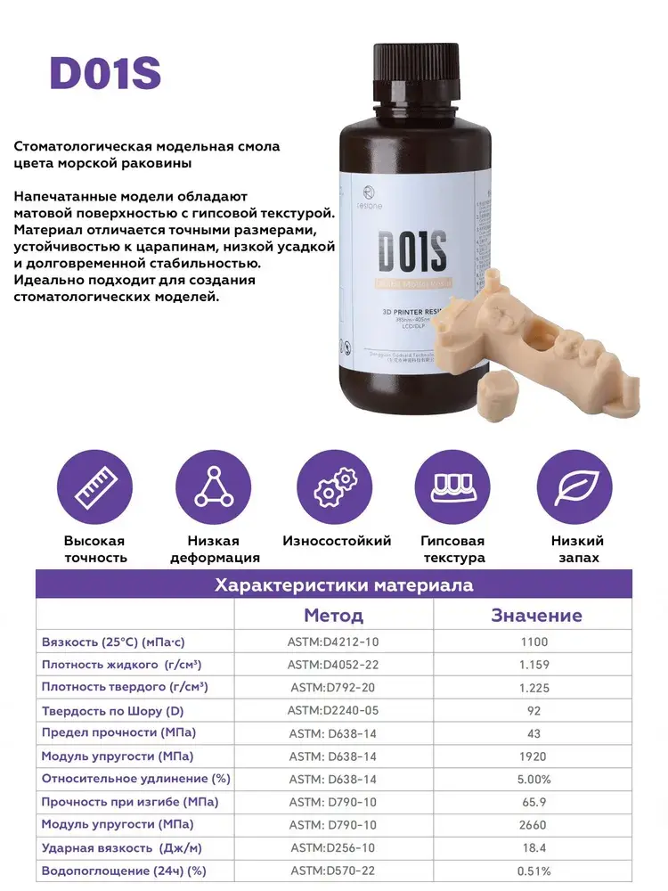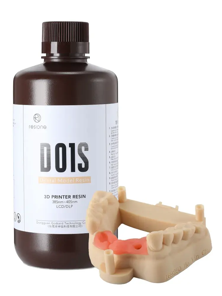 Фотополимер RESIONE D01S — специализированная смола для использования в сфере стоматологии. Изделия из неё имеют прекрасную детализацию, достаточно высокую прочность и устойчивы к царапинам. Этот фотополимер обладает всем необходимым для профессионального использования. Он обеспечивает высокую детализацию и точность размеров, даёт гладкую поверхность с повышенной устойчивостью к износу. Усадка при полимеризации получается минимальной. Фотополимер RESIONE D01S прекрасно подходит для создания как учебных, так и реставрационных стоматологических моделей, а также моделей зубных имплантов. Фотополимер RESIONE D01S показывает отличные результаты на 3D принтерах, работающих по технологиям DLP и LCD. Он полностью совместим с большинством моделей от Anycubic, Elegoo, Phrozen, Nova3D, QIDI TECH, Wanhao, Creality, Flashforge, UNIZ и других, которые используют длину волны 405 нм.